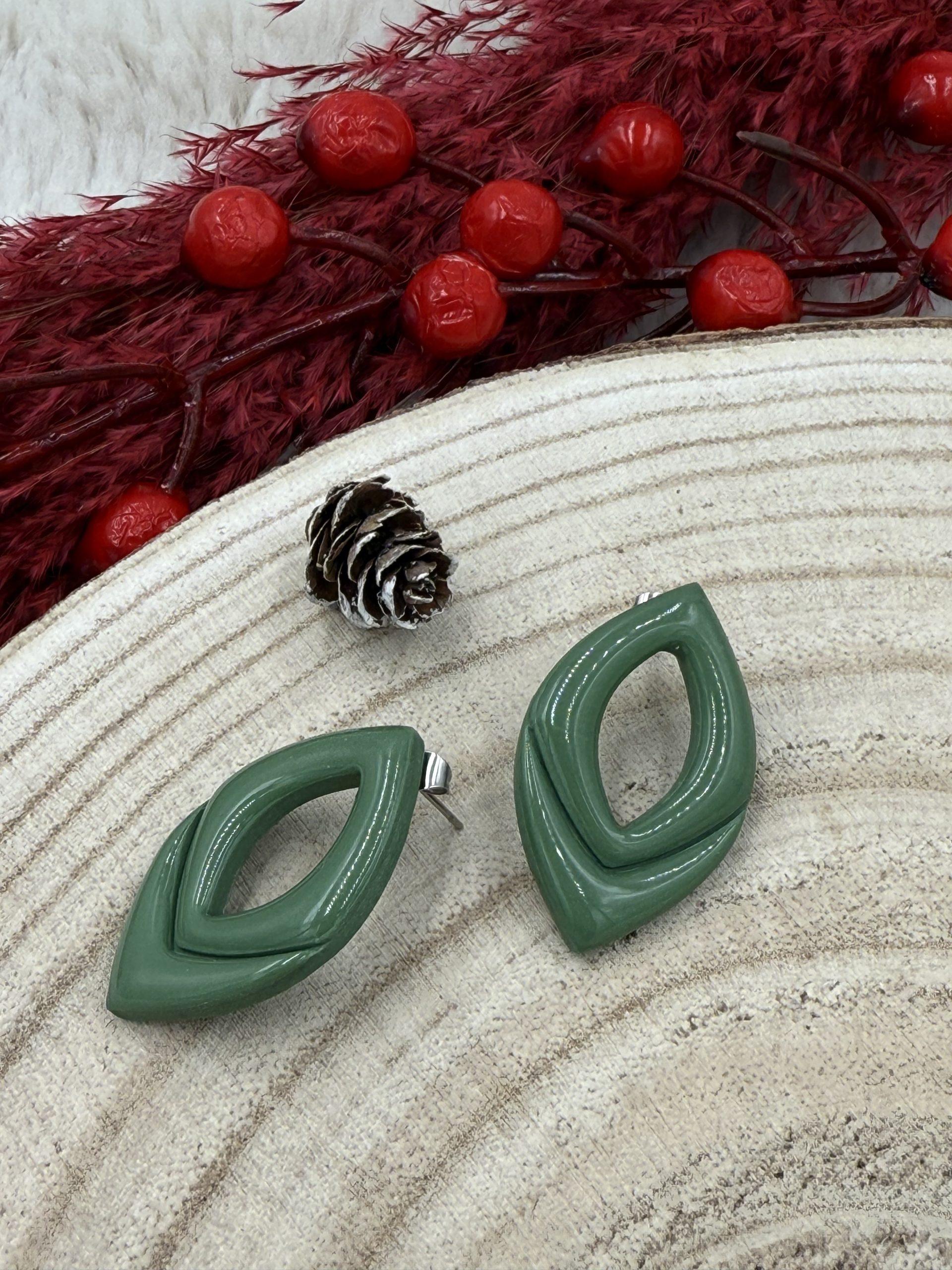 Χειροποίητα σκουλαρίκια από πολυμερικό πηλό με γυαλιστερό φινίρισμα και ιδιαίτερη πράσινη απόχρωση, που ξεχωρίζουν για την κομψότητά τους. Το ιδιαίτερο σχήμα και οι λεπτομέρειες τους δημιουργούν μια ξεχωριστή εμφάνιση, ιδανική για καθημερινές εμφανίσεις ή πιο ξεχωριστές στιγμές.
