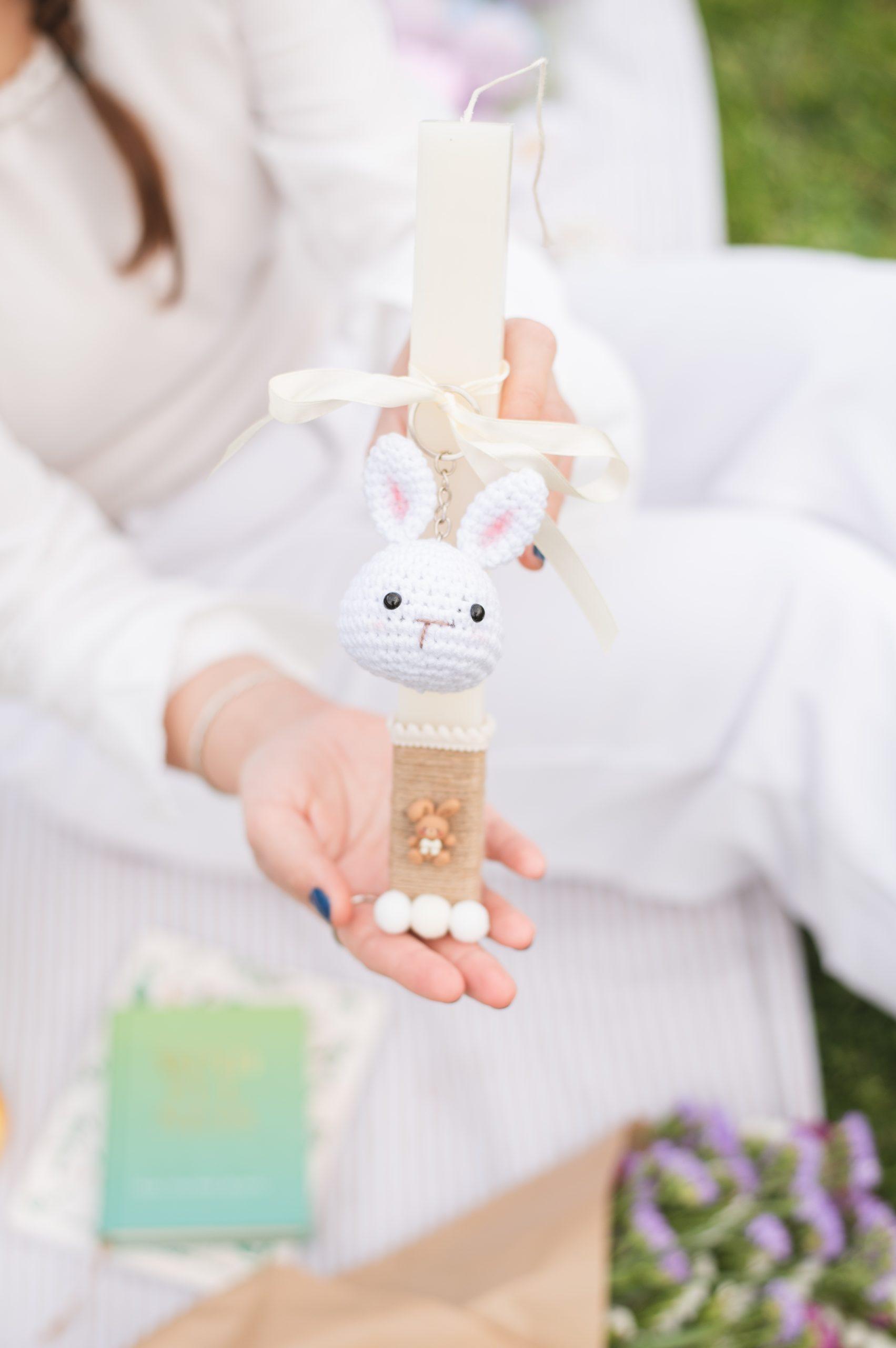 Χειροποίητη λαμπάδα με κουνελάκι μπρελόκ πλεγμένο στο χέρι και όμορφο στολισμό.